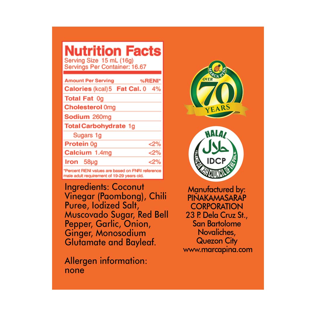 Coconut Vinegar (Paombong), Chili Puree, Iodized Salt, Muscovado Sugar, Red Bell Pepper, Garlic, Onion, Ginger, Monosodium Glutamae, and Bayleaf.